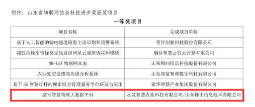 2月3日,山东省物联网协会公布了2020年度山东省物联网协会科技进步奖获奖项目。水发智慧产业集团下属公司申报的温室智慧物联大数据平台项目、基于LTE Cat M技术的超声波智能水表研究与应用项目,分别荣获山东省物联网协会科技进步一等奖和二等奖。