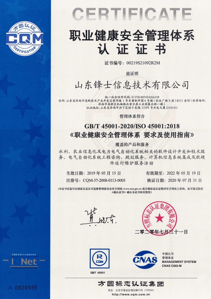 职业健康安全管理体系认证证书