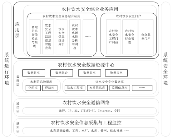 感知层:实现各类农村饮水安全信息的人工采集或自动采集,关键技术包括智能终端技术和物联网技术。